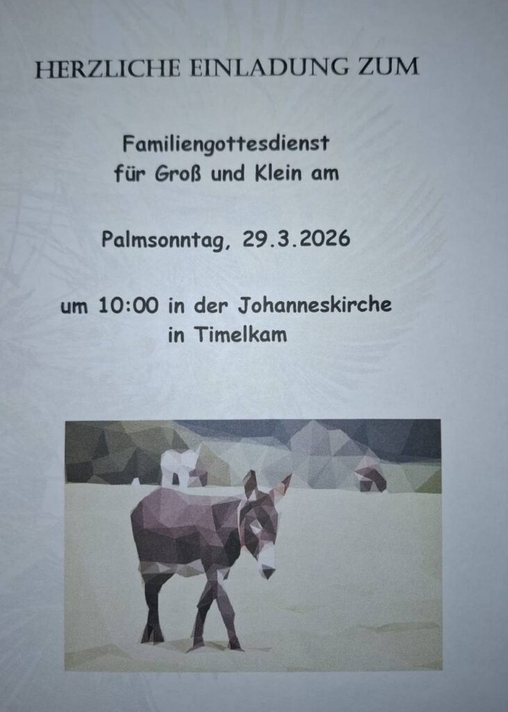 9. März 2026Am Palmsonntag um 10.00 Uhr findet in der Johanneskirche in Timelkam ein Familiengottesdienst statt.